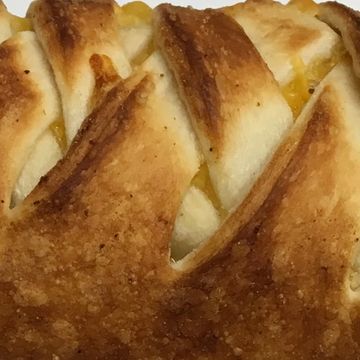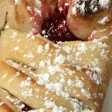 Sweet ricotta base topped with crushed oreo or chopped peanut butter cups inside a braided turnover. Finished with powdered sugar and chocolate syrup