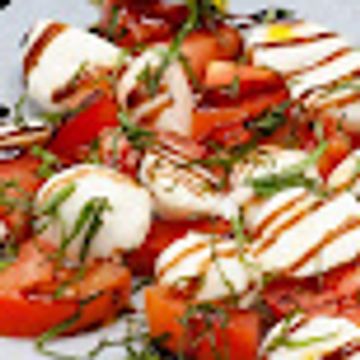 Diced tomatoes, mozzarella pearls, and basil, finished with olive oil and balsamic glaze. Available in two sizes.