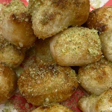Bite-sized bread finished with butter, garlic, and grated romano.